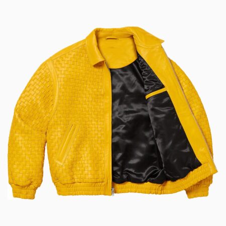Woven lambskin leather with fill and satin lining. Full zip closure with welt hand pockets at lower front and interior chest pocket. Elasticized leather cuffs and hem. Leather logo appliqué at back.