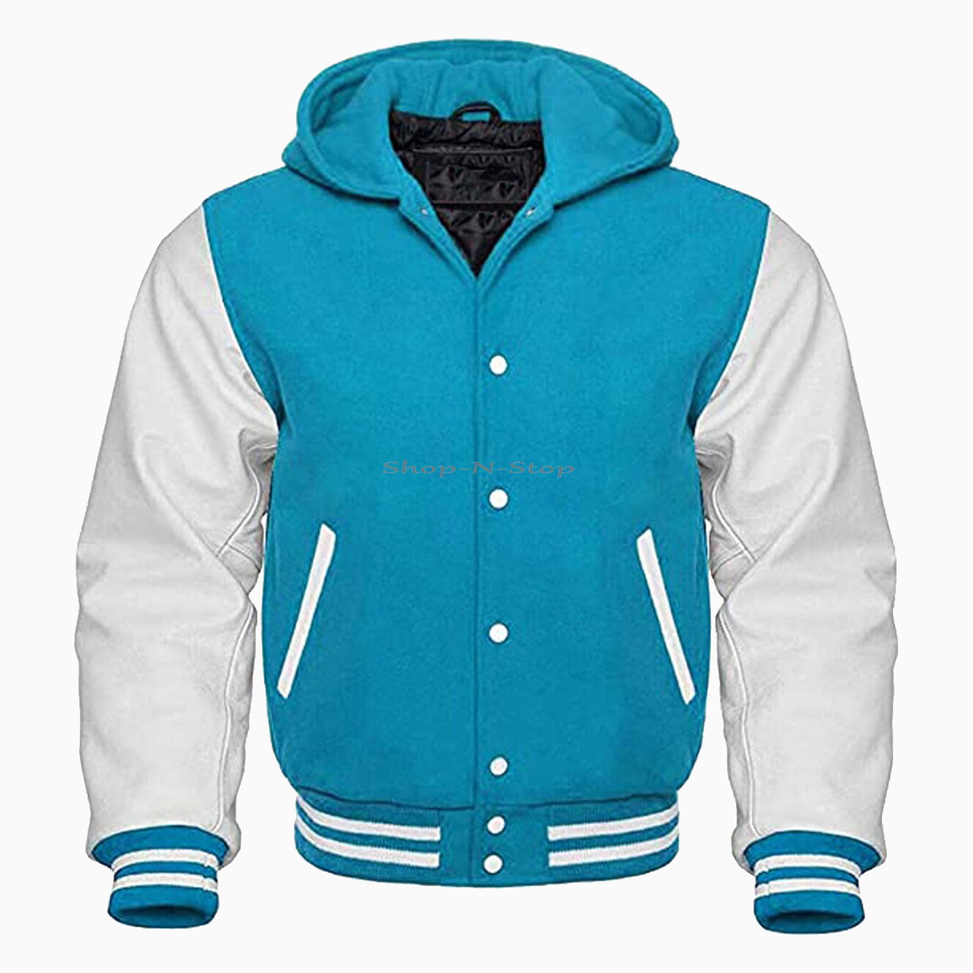 Hooded Varsity Letterman Baseball Bomber Jacket, 100% Melton Wool Body, Cowhide Leather Sleeves, All colors options