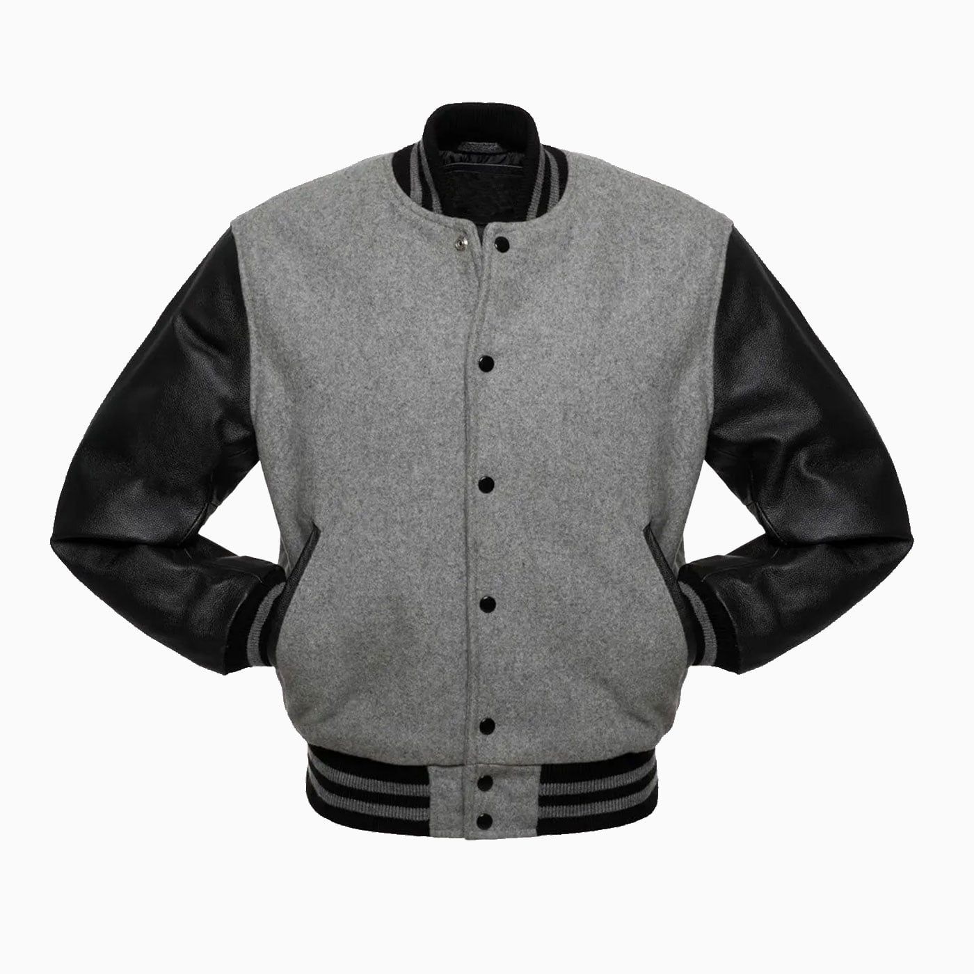 Mens Light Grey Wool Body & Black Leather Sleeves Varsity Jacket