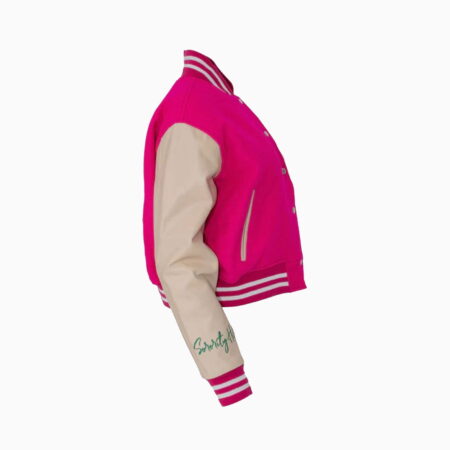 Custom Pink Crop varsity jacket with high standing collar, front snap buttons , 100% authentic cowhide leather sleeves, pockets trimmed with leather and a ribbed hem and cuffs. Detailed with Embroidery on lower left and right Arm. Also includes Chenille patch on left chest , Chenille patch on left arm , chenille patch on back of jacket.