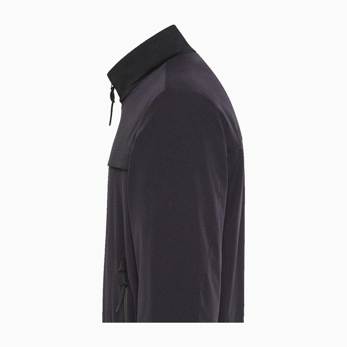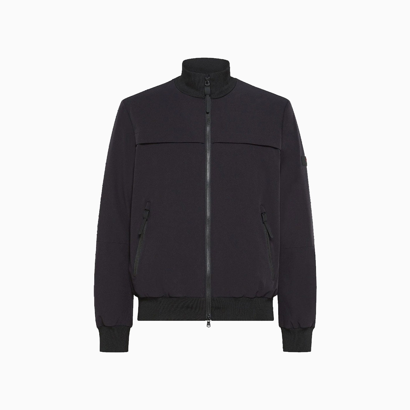 Smooth, soft-shell bomber jacket in stretch nylon paired with soft, warm nylon jersey with Primaloft padding. Heat-sealed black zips, black knit collar and cuffs, side zipped pockets with rubber pullers, and Peuterey logo on the left shoulder.