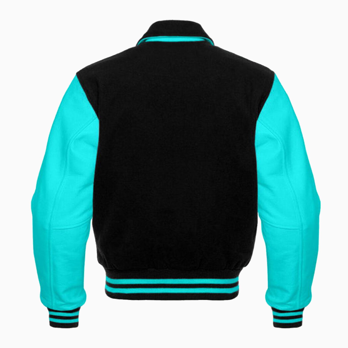 Stylish Black Retro Letterman Jacket is made of high-quality Melton Wool and shoulders are made of cowhide leather. This varsity jacket comes with a black body, turquoise sleeves, black collar with turquoise leather trimming, and black rib with turquoise stripes. The high-quality cotton rib is used for cuffs and hem. This jacket fastening comes with coated snaps on the front and quilted diamond laser lining is used to make warm the jacket.