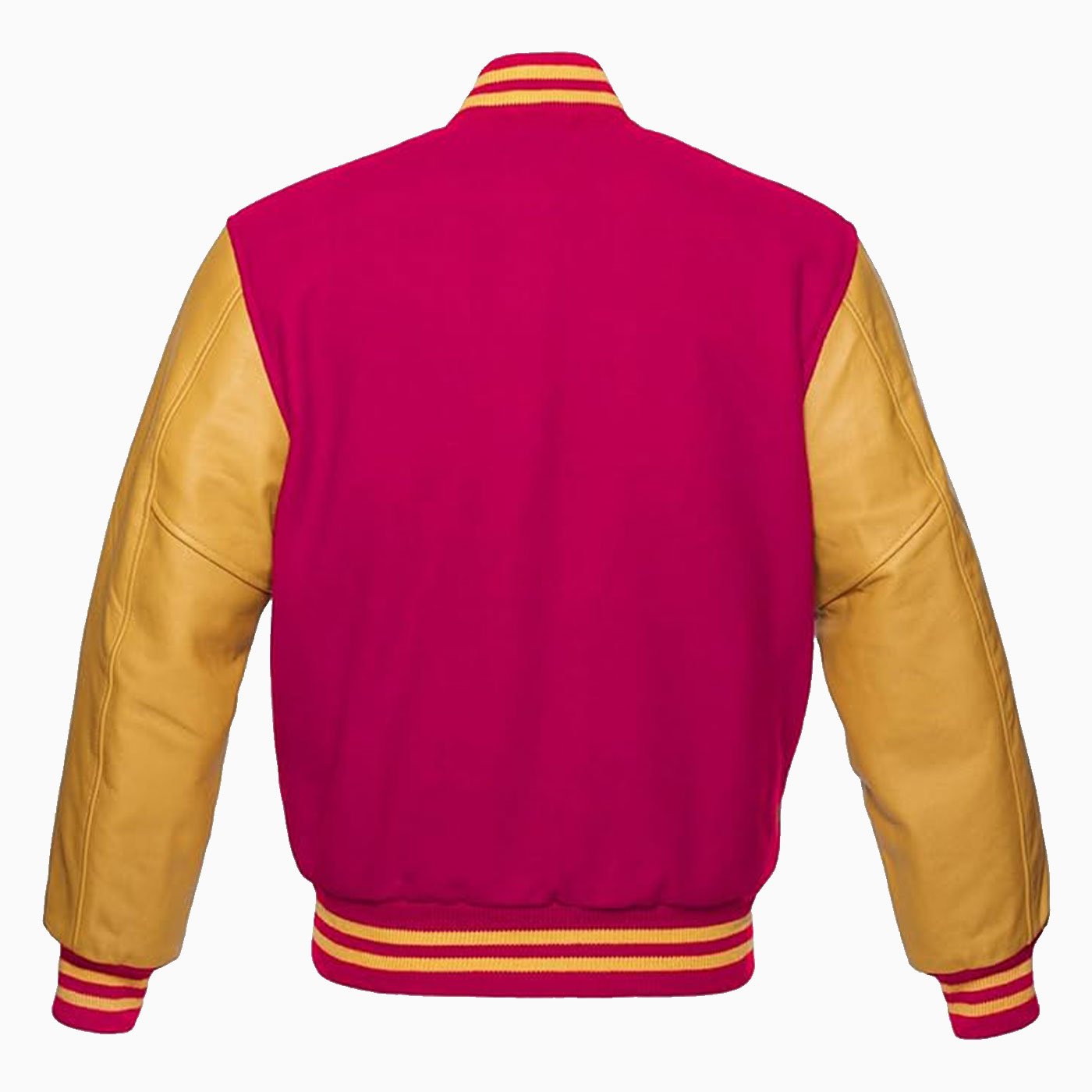 Varsity Jacket Letterman Baseball College Jacket Fashion Hot-Pink Wool Body And Gold Leather Sleeves Jackets